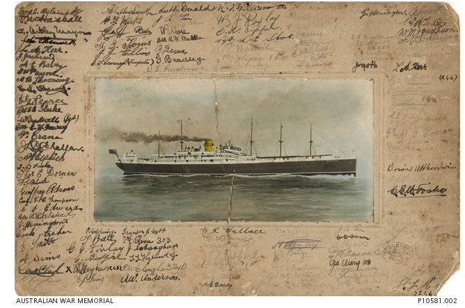 AWM P10581.002. HMAT 'Argyllshire.' Photographer unknown, photograph sourced from the Pictorial Collection of the Australian War Memorial