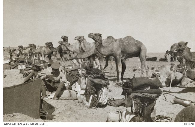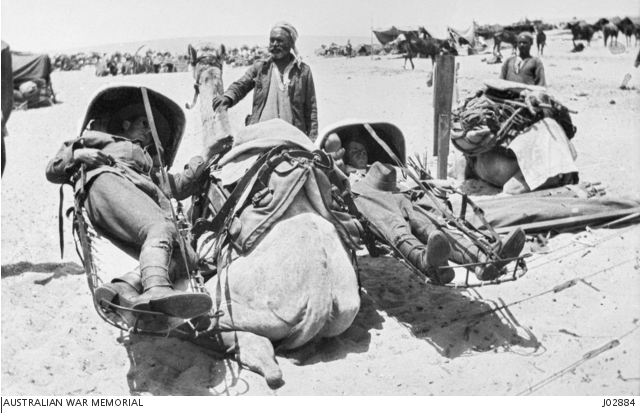 AWM H00728. Australian Camel Corps Field Ambulance 1917. Photographer unknown, photograph sourced from the Pictorial collection of the Australian War Memorial