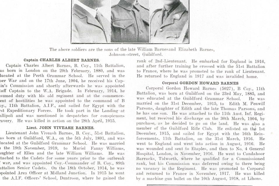 Barnes had 2 brothers who also served- Captain Charles Albert Barnes of the 11th Battalion who was KIA at Gallipoli and Lieutenant John Viveash Barnes who returned home invalided.