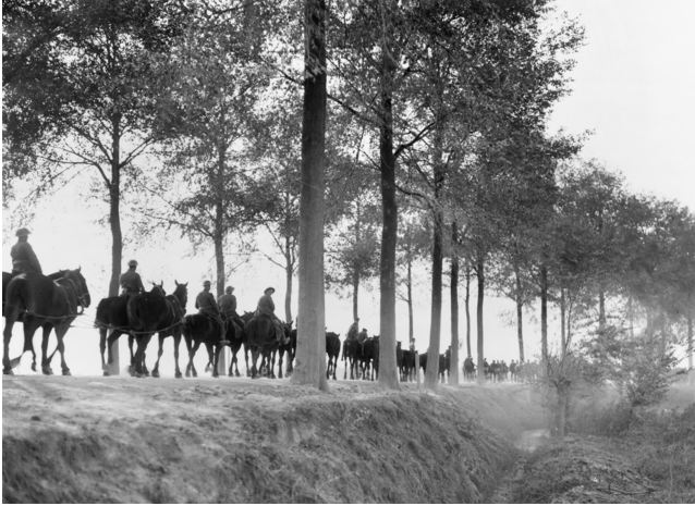 AWM E00827. Artillery Horses on the road between Popperhinge and Ypres.1917. Photographer unknown, photograph sourced from the Pictorial Collection of the Australian War Memorial