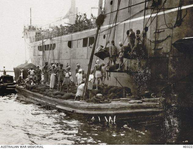 AWM H0322. HMAT 'Chilka' coaling up in Colombo, Ceylon 1915. Photographer unknown, photograph sourced from the Pictorial Collection of the Australian War Memorial