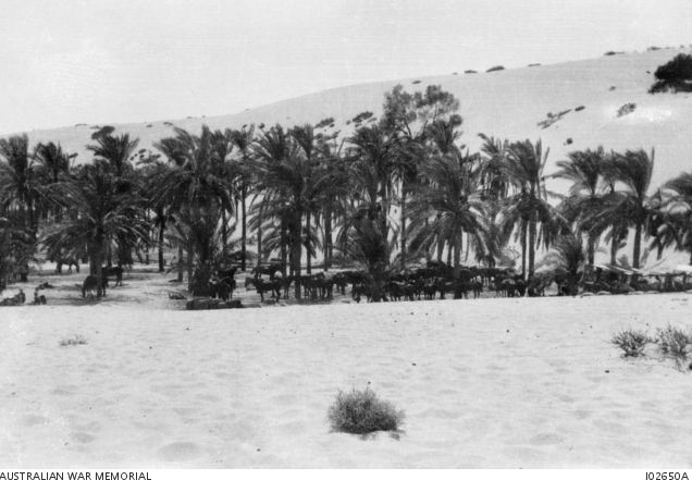 AWM I02650A. 10th Light Horse concealed and shaded by an oasis near Romani 1916. Photographer unknown photograph sourced from thePictorial Collection of the Australia War Memorial