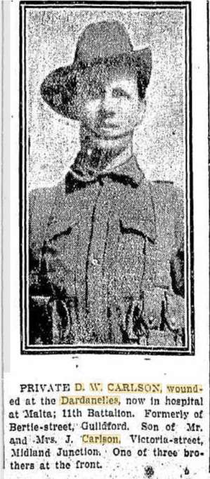 Carlson disembarked in Egypt with ‘B’ Company of the 11th Battalion. After a period of intensive training, he entrained to Alexandria, joined the MEF and embarked per HMT ‘Suffolk’ for the Gallipoli Peninsula 2.3.1915. The 11th Battalion received orders to relieve the 12th Battalion at Tasmanian Post on 27.7.1915. On the 31st they were ordered forward to attack the Turkish Trenches. Carlson was wounded in this action 31.7.1915, receiving a bomb wounds and scalding to his back, arm, scalp and a bullet wound to his foot. He was taken to the 1st Australian Casualty Clearing Station 1.8.1915, then transferred to Hospital Ship ‘Devanha’ 1.8.1915. Carlson was admitted to Hospital in Malta 5.8.1915, transferred to Cottonera Military Hospital, then was admitted to St Patrick’s Hospital 17.8.1915 with gunshot wound to shoulder. Carlson was discharged from Hospital, deemed fit for active service and embarked for Egypt per HMT ‘Karoa’ 26.9.1915. He marched in to Mustapha 30.9.1915, was taken on strength with 11th Battalion and rejoined his unit at Tel-el-Kebir 7.1.1916.