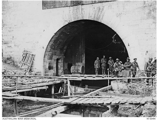 AWM H15944. Allied soldiers at the entry to the St.Quentin Canal, October 1918. Photographer unknown, photograph sourced from the Pictorial Collection of the Australian War Memorial
