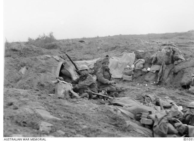 AWM E01051. Soldiers in a shelter, Broodseinde Ridge 1917. Photographer unknown, photograph sourced from the Pictorial Collection of the Australian War Memorial