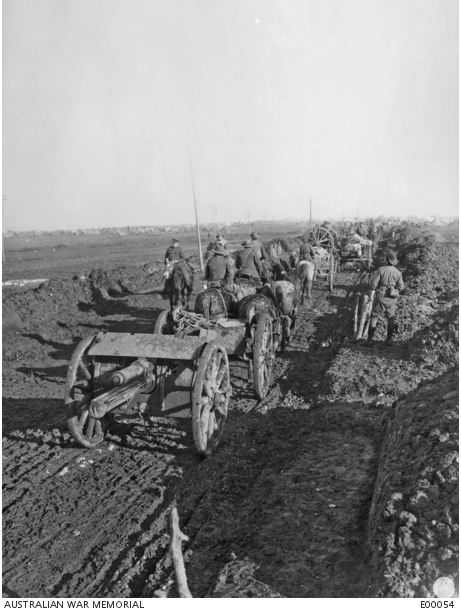 AWM E00054.Artillery Column on the Mametzmontauban Road December 1916. Photographer unknown, photograph sourced from the Pictprial Collection of the Australian War Memorial