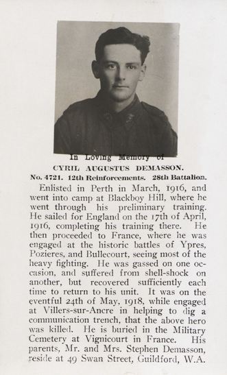 Demasson, Cyril Augustus. Private. 28th Battalion. SN 4721. Died of wounds received at Villers-sur-ancre, France. 24.5.1918. Age 21 years