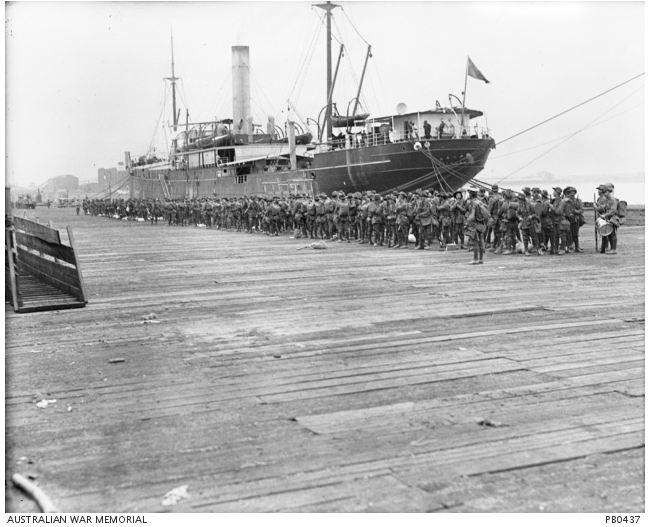 AWM PB0437. Troops boarding HMAT 'Hororata' 1915. Photographer Josiah Barnes, photograph sourced from the Pictorial Collection of the Australian War Memorial