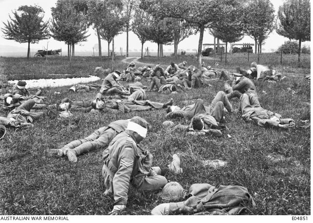 AWM E04851. Gassed Australian soldiers awaiting treatment, Boise deL'Abbe 1918. Photographer unknown, photograph sourced from the Pictorial Collection of the Australian War Memorial
