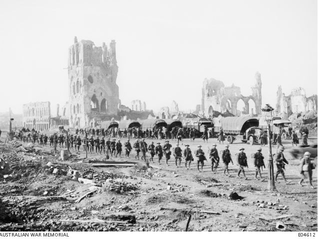 AWM E04612. Anzac Soldiers marching to the front line, Ypres 1917. Photographer F. Hurley, photograph sourced from the Pictorial Collection of the Australian War mMmorial