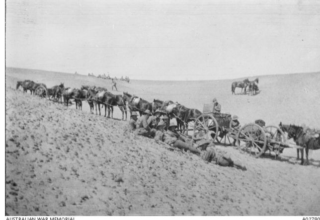 AWM I02650A. 10th Light Horse concealed and shaded by an oasis near Romani 1916. Photographer unknown photograph sourced from the Pictorial Collection of the Australian War Memorial