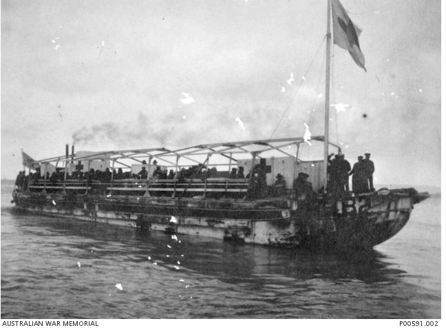 AWM P00591.002. Gallipoli. Hospital barge carrying sick and wounded  to Hospital Ships. Photographer unknown, photograph sourced from the Pictorial Collection of the Australian War Memorial