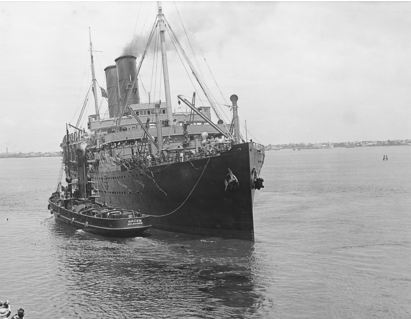 Photos HMAT 'Orsova' A67 pushed by tug. Photographer Josiah Barnes, photograph source AWM PB0776