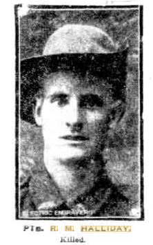 Halliday disembarked at Plymouth 2.12.1916 with the 51st Bn. He marched in to the 13th Training Bn. at Codford and reverted from A/Cpl to permeant rank. He was admitted sick to hospital 13.1.1917 with parotitis to the 3rd General Hospital at Brockenhurst. He qualified as an instructor in Bomb throwing at the Southern Command School. He was appointed Acting Cpl. 25.6.1917 and was taken on strength with the 51st Bn. 1917. He reverted to rank and proceeded overseas to France with the 13th Training Bn. 16.7.1917. Halliday marched in to the 4th Division Base Details at Havre 17.7.1917 and was taken on strength in the Field 3.8.1917. He was allotted letter B to his Service No. 10.8.1917. The 51st Bn. fought at the Battle of Polygon Wood in September 1917. Halliday was admitted to 39th Stationary Hospital with an acute Appendicitis 2.11.1917 and transferred to the 13th General Hospital at Boulogne 17.11.1917. He was discharged and cleared as fit for active service 1918 and rejoined his unit 8.12.1917. The 51st Bn. assisted repulse a large enemy attackat Ancre, known as the German 'Spring Offensives', in the Picardy sector in April 1918. On April 5th 1917 (AWM 51st Bn). Halliday was KIA with a GSW to the head 6.4.1918. He was buried in a shell hole by his Company. It was not possible to mark the site with a cross. Halliday’s body was not recovered. He is commemorated at the Villers-Bretonneux Memorial, Villers-Bretonneux, Picardie. France.