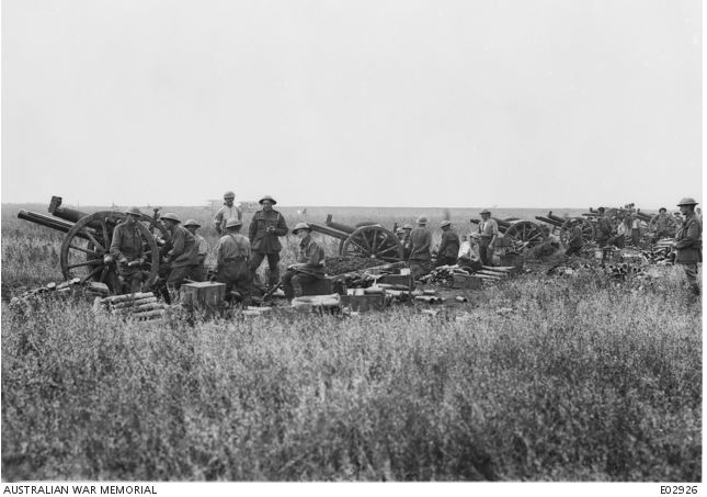 AWM E02926. Artillery Line at Villers-Bretonneux 1918. Photographer unknown, photograph sourced from the Pictorial Collection of the Australian War Memorial