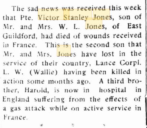Notes Harold had a twin brother, Victor Stanley and a brother Lionel Walter Jones who were KIA in WW1