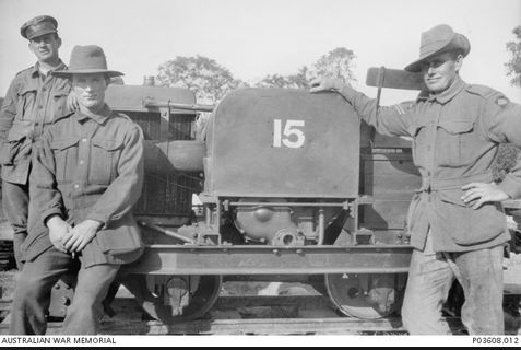 AWM P03608.012. Unidentified soldiers from one ofthe Australian Railway operating companies next to a Simplex-narrow gauge tractor. Photograph sourced from the Pictorial Collection of the Australian War Memorial