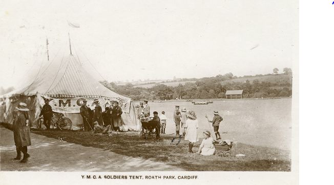 Roath Park, YMCA soldiers' tent for convalescing soldiers. Postcard source, http://www.roathremembers.net/places/roath-park-in-the-great-war/