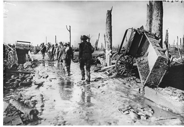 Australian Soldiers en route to the Front line at Flanders, October 1917. Photographer unknown, photograph source AWM E01187
