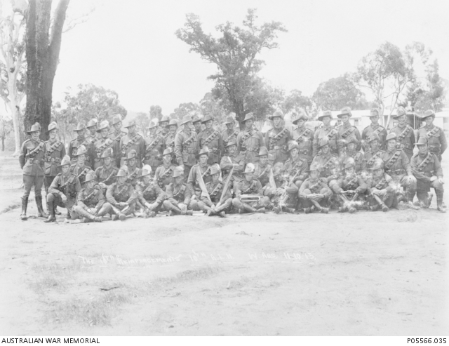 Photo Tpr. Reginald Sanford King( 2nd row 5th from right) with 10/10 LH Blackboy Hill 1915 AWM P05566.035