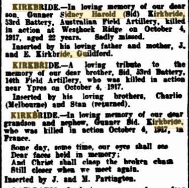 Kirkbride, Sidney Harold. Gunner.53rd Battery 14th Australian Field Artillery. S.1303. KIA Westhoek, Belgium 4.10.1917. Age 22 years