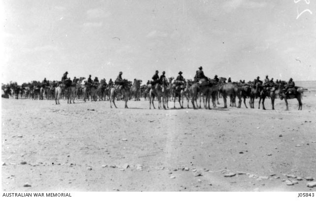 AWM J05843. 1st Australian Camel Corps at Suez c 1917. Photograph donor Cptn. J.D. Cramb, photograph sourced from the Pictorial Collection of the Australian War Memorial