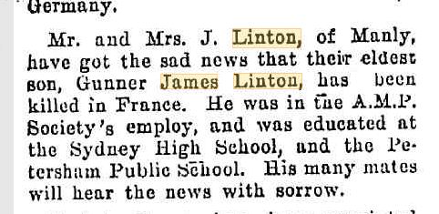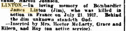 Linton, James. Gunner. 1st Australian Field Artillery (AFA). SN 12302. KIA France. 21.7.1917. Age 32 years
