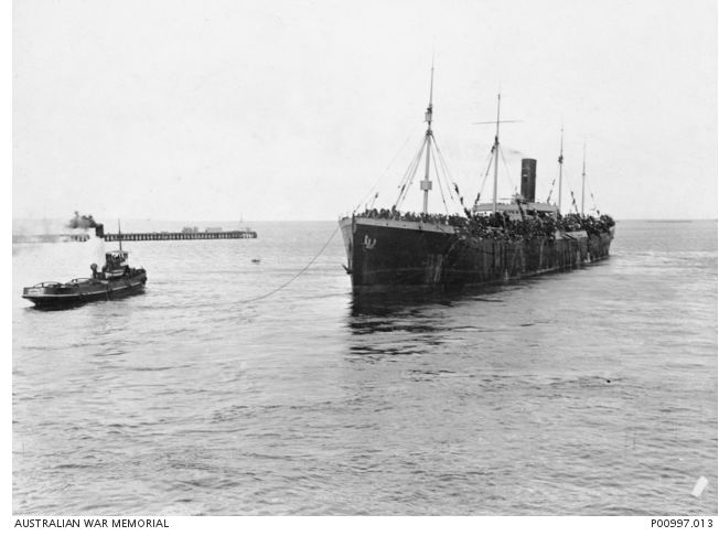 HMAT 'Persic' leaving Melbourne Wharf. Photographer Josiah Barnes, photograph source AWM P00997.013