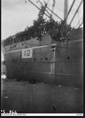 AWM PS0366. HMAT 'Geelong' pulling into the wharf at Alexandria. Photographer Schuler P.F.E., photograph sourced from the Pictorial Collection of the Australian War Memorial