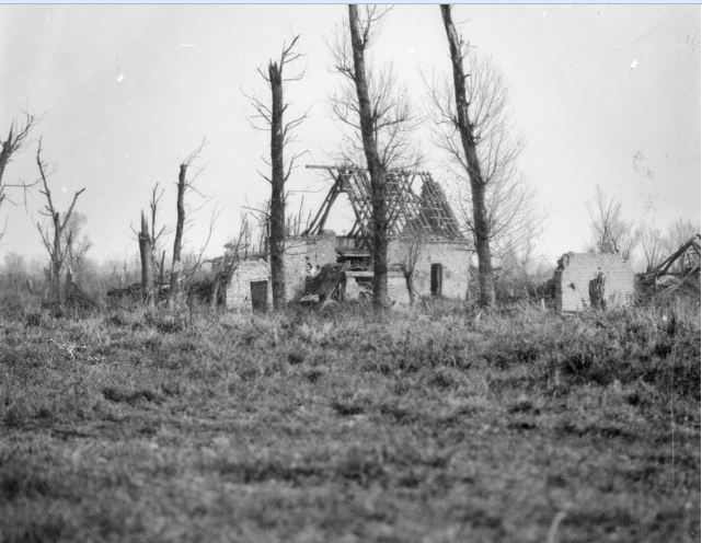 AWM E04039. Ruined farm on the Fromelles battlefield- damaged in action July 19-20th 1916 battle. Photographer unknown, photograph sourced from the Pictorial Collection of the Australian War Memorial