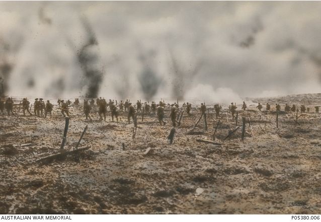 AWM P0538.006. Attack on Polygon Wood 1917. Postcard by Colart Studio 1921, image sourced from the Pictorial Collection of the Australian War Memorial
