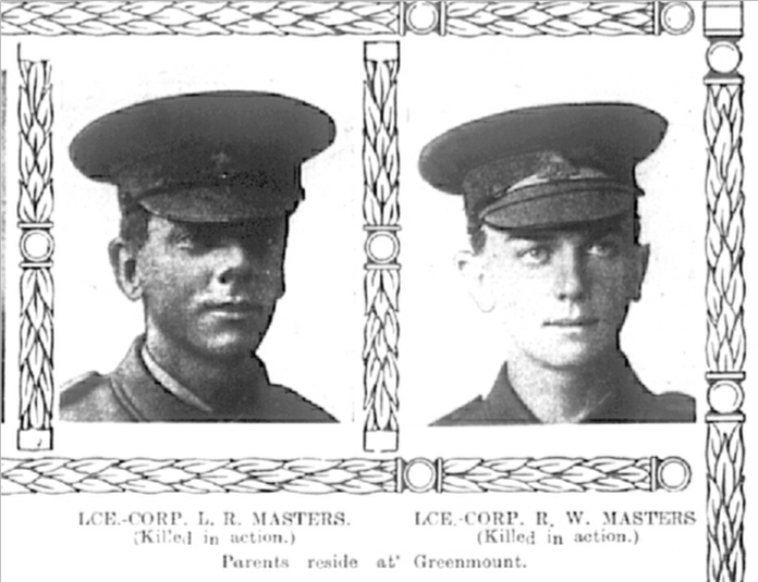 Masters was KIA at Messines in the Field 26.1.1918. He was buried where he fell (Report Messines 71.11E). His body was exhumed and re-interred in 1920 to the Messines Ridge British Cemetery- Australian Section, Messines, Flanders, Belgium.