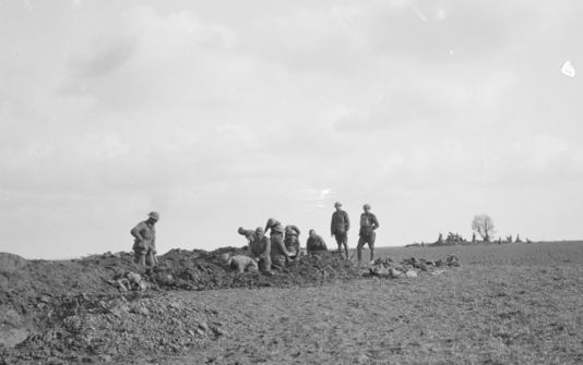 AWM E01849. 3rd Division Infantry digging trenches at Mericourt, March1918. Photographer unknown, photograph sourced from the Pictorial Collection of the Australia War Memorial