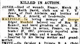 G E Maxfield. Western Mail, Family Notices 22.3.1918 p19