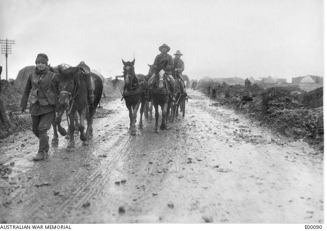 AWM E00090. Australian Artillery pack horses in France. Photographer unknown, photograph sourced from the Pictorial Collection of the Australian War Memorial