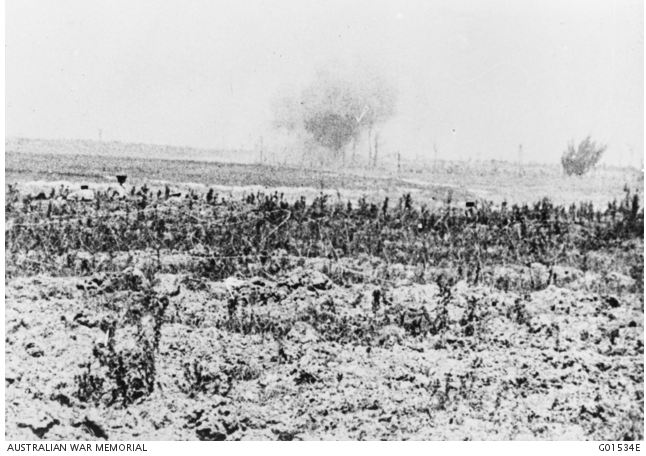 AWM G01534E. Pozieres under attack by German artillery. Photographer unknown, photograph sourced from the Pictprial Collection of the Australian War Memorial