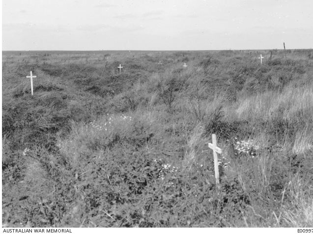 AWM E0997. Scattered graves at Kay's Trench Pozieres 1917. Photographer unknown, photograph sourced from the Pictorial Collection of the Australian War Memorial