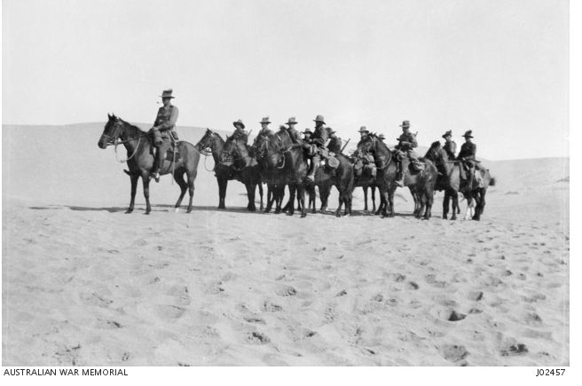 AWM J02457. 10th Light Horse on patrol in the Suez Canal Zone 3.8.1916. Photograph donated by Maj. L.C.Timperley, photograph sourced from the Pictorial Collection of the Autralian War Memorial
