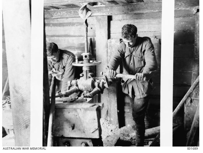 AWM  E01689. 3rd Australian Tunnelling Coy. drilling a ventilation hole in a tunnel 1917. Photographer unknown, photograph sourced  from the Pictorial Collection of the Australian War Memorial