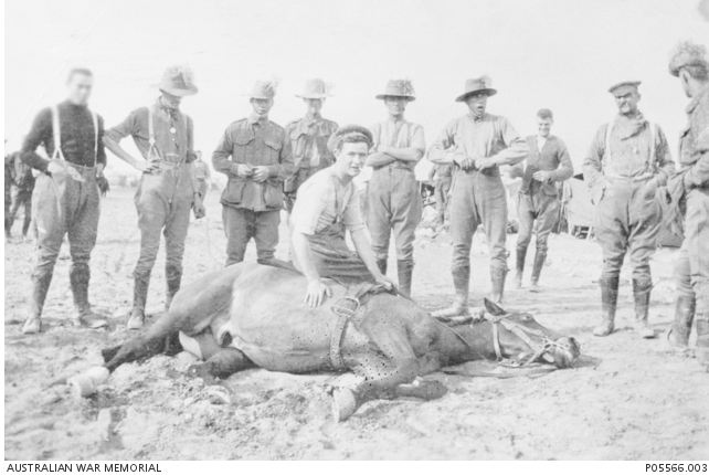 AWMP0556.003. 10 LH in Egypt with horse trained to lie down. Tpr. Overton 2nd from left. Photographer R.G.Hummerston, photograph sourced from the Pictorial Collection of the Australian War Memorial