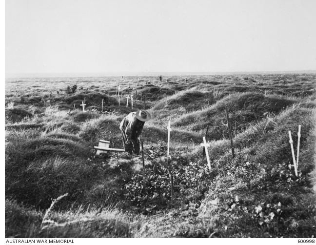 AWM E00998. Graves at Pozieres 1917. Photographer unknown, photograph sourced from the Pictorial Collection of the Australian War Memorial