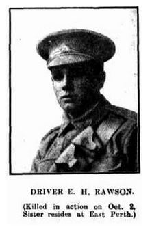 Rawson disembarked at Plymouth, England 19.11.1916. He marched in to Boyton Camp, Wiltshire with his unit 7.1.1917. After a period of intensive training, he proceeded overseas to France from Southampton 26.3.1917. Rawson was taken on strength with 54th Battery 14th Field Artillery Brigade 31.3.1917. The 14th FAB was raised to support the 5th Division. The 14th Brigade fought at Passchendaele in October 1917. Rawson was KIA In the Field France 2.10.1917. Red Cross files describe that he was driving horses carrying ammunition when he was hit by a shell and buried near Hell Fire Corner (AWM Red Cross File) (West Australian Newspapers 17.11.1917) He was buried by 1st ANZAC Corps at Bellewaarde Ridge, Military Cemetery. 28 Miles NE. 10.10.1917. The War Graves Commission re –interred his body to Birr Cross Road Military Cemetery, Plot 2, Row C, Ypres.