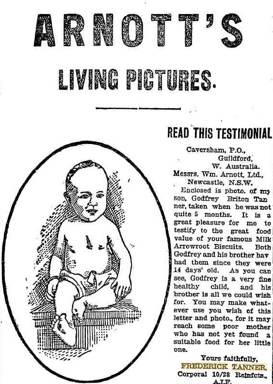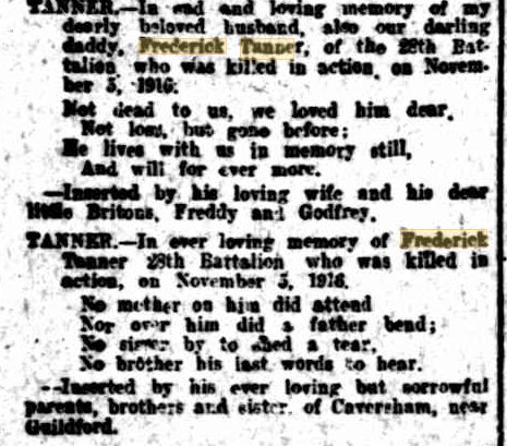 Notes Tanner married Mary nee O'Donnell in 1913. (WA Record 8.2.1913 p11) they had two little sons Frederick and Godfrey. Frederick worked in various occupations including bar tender and grocer. His wife inherited little in probate from Tanner after his death and a published advertisement by Arnotts Biscuits assisted her supplement her income (Daily News 26.5.1917). Tanner had two brothers Ernest (SN 7147) also KIA and a brother George (SN 4312) who returned. Tanner's wife moved to Mirrool, NSW. after his death. Tanner’s name is also listed on the Anglican Church Honour Roll in Moora (Midlands Advertiser 10.1.1919).