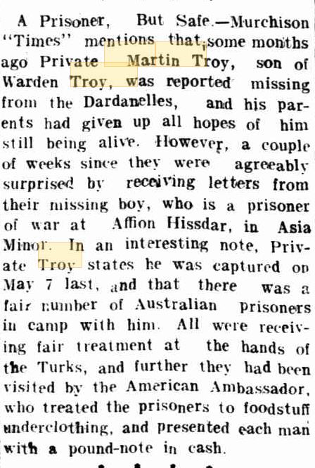 Troy was was reported missing 1.5.1915. He was taken Prisoner of War in the Kaba Tepe (Gaba Tepe) Region, Turkey. Troy was then transferred to Afion Kara Hissar Camp 2.5.1915. (reported West Australian Newspaper 13.11.1915). He was confirmed as still at Afion Kara Hissr 'Afyonkarahisar) by the American Embassy 21.2.1916. The Ottoman Red Crescent reported Troy was interned at Belemedik near Pozanti 12.3.1916. The Ottoman Red Crescent also reported that Troy had returned to Afion Kara Hissar 11.3.1917. Troy moved from Afion Kara Hissar to a new camp at Belmedik (about 900 kilometres south-east of Constantinople) in January 1916. He was employed by the Bagdad Railway Construction Company to work on building the railway and tunnel through the Taurus mountains.(G. Hutchinson 2013) Troy was repatriated to England and disembarked at Dover 8.12.1918. He marched out from the Australian HQ London, to Weymouth 11.1.1919 and was listed for return to Australia.