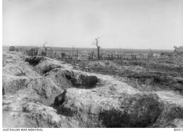 AWM E00511. Pozieres village destroyed by shell fire 1916.  Photographer unknown, photograph sourced form the Pictporial Collection of the Australian War Memorial